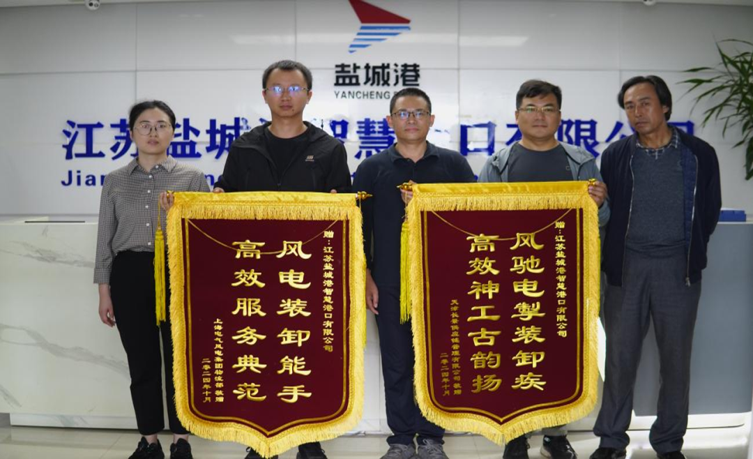 近日,智慧港口公司收到天津長景供應鏈管理有限公司和上海電氣風電集團物流部送來寫有“風馳電掣裝卸疾,高效神工古韻揚”“風電裝卸能手,高效服務典范”字樣的兩面錦旗,字里行間,映照著客戶對鹽城港裝卸服務最誠摯的謝意和加倍的認可。