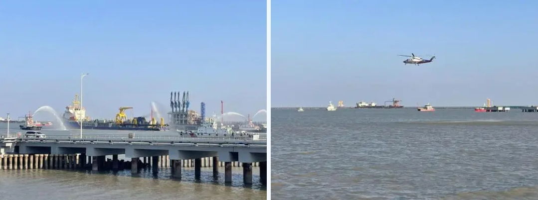 演習(xí)模擬LNG船舶,在碼頭卸貨時(shí)LNG意外泄漏,隨后展開(kāi)泄漏可燃?xì)怏w消防稀釋、人員和船舶緊急疏散撤離、落水人員搜救等應(yīng)急處置。
