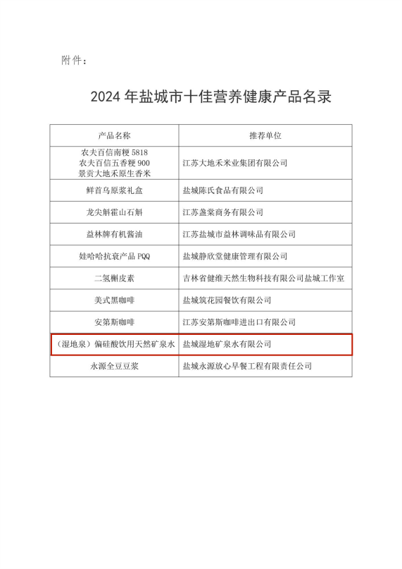 近日,鹽城市十佳營養健康產品評選結果出爐,鹽城濕地礦泉水有限公司“濕地泉”系列偏硅酸飲用天然礦泉水榮獲2024年鹽城市十佳營養健康產品稱號。