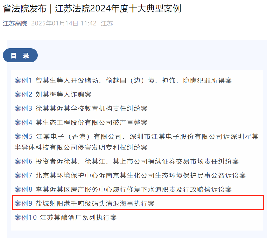 2025年1月14日,江蘇省高級人民法院發(fā)布2024年十大典型案例,鹽城港射陽港千噸級碼頭清退海事執(zhí)行案成功入選。
