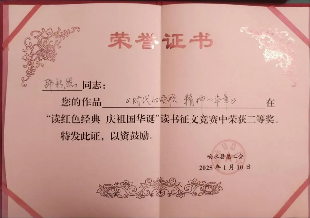 近日,由響水縣總工會(huì)舉辦的2024年度“讀紅色經(jīng)典、慶祖國(guó)華誕”職工讀書(shū)征文競(jìng)賽活動(dòng)結(jié)果相繼公布,江蘇響水港物流有限公司業(yè)務(wù)組邵新然的《時(shí)代的頌歌,精神的華章》在眾多作品中脫穎而出,榮獲征文競(jìng)賽二等獎(jiǎng)。