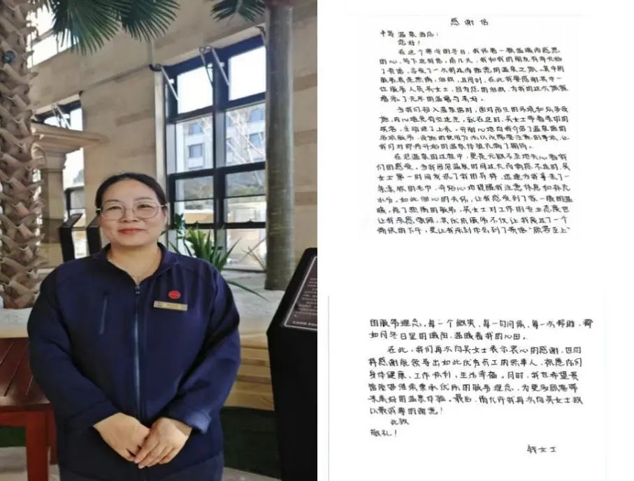 在港泊半島酒店,暖心的故事每天都在上演。近日,酒店收到了一封來自溫泉館客人的感謝信。信中,客人用真摯的筆觸,對(duì)溫泉館員工吳月華的服務(wù)賦予了極高的評(píng)價(jià)。為了弘揚(yáng)這種敬業(yè)精神,樹立酒店服務(wù)的全新標(biāo)桿,港泊半島酒店開展了向優(yōu)秀榜樣吳月華學(xué)習(xí)的活動(dòng)。每一位員工都積極響應(yīng),將熱忱融入日常服務(wù)的每一處。他們以實(shí)際行動(dòng)詮釋著五星級(jí)酒店的品質(zhì)與擔(dān)當(dāng),致力于為每一位賓客打造更加優(yōu)質(zhì)、貼心、溫暖的入住體驗(yàn),用心雕琢著港泊半島酒店的卓越口碑。