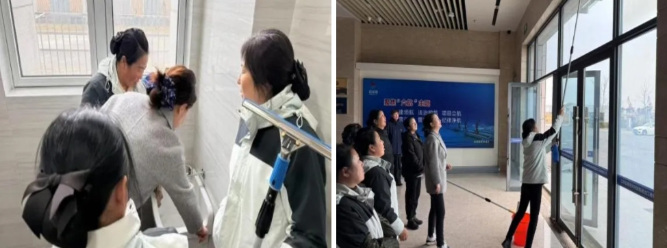 培訓(xùn)現(xiàn)場圍繞重點區(qū)域清潔、保潔工具使用技巧、保潔頻次和保潔規(guī)范等方面,采用現(xiàn)場教、實地訓(xùn)的方式,詳盡重點,確保每位保潔員都能將作業(yè)技巧、標(biāo)準(zhǔn)要求了然于心。實操中,保潔組全員化身“清潔奇兵”,各司其職,嚴(yán)格按規(guī)范操作,以日常保潔、深度清潔、機制清潔的高標(biāo)準(zhǔn),為港區(qū)營造了干凈、整潔的工作環(huán)境。
