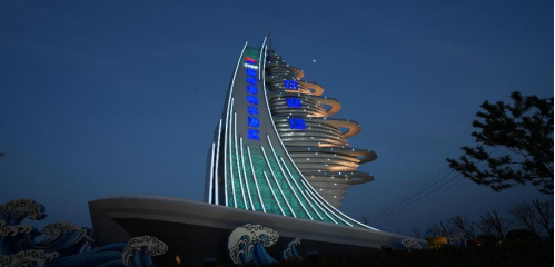建筑主體采用流線型鋼結(jié)構(gòu),以抽象化的帆船造型呼應(yīng)“乘風(fēng)破浪”主題。藍白雙色設(shè)計中,深藍基座象征海洋底蘊,漸變的白色帆體展現(xiàn)破浪而上的動勢。寓意著鹽城港人腳踏實地、堅守初心,向著未來奮勇逐夢、揚帆遠航。當夜幕降臨時,LED燈帶沿結(jié)構(gòu)輪廓逐層點亮,在港區(qū)門戶形成鮮明的視覺標識。