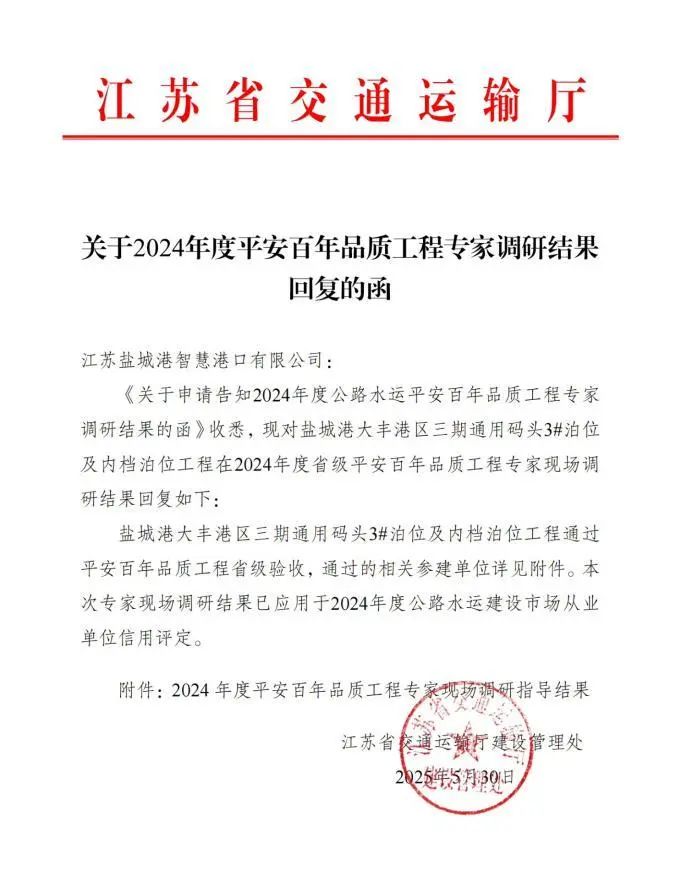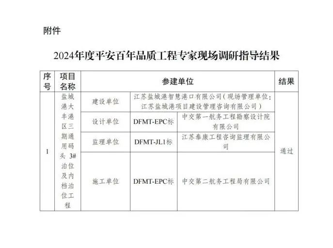 近日,省交通運輸廳公布2024年度“平安百年品質工程”專家現(xiàn)場調研指導結果,鹽城港大豐港區(qū)三期通用碼頭3#泊位及內檔泊位工程成功通過,標志著鹽城港在省級“品質工程”創(chuàng)建領域取得了歷史性突破。