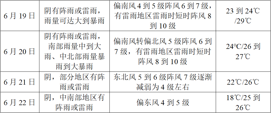 19-22日過程雨量:80~150毫米,局部180~220毫米,雨量主要集中在19-20日,21日雨帶逐漸南壓,22日降水主要在中南部地區(qū)。降雨期間局地可能伴有雷電、小時(shí)雨強(qiáng)40~70毫米的短時(shí)強(qiáng)降水和8~10級(jí)雷暴大風(fēng)等強(qiáng)對(duì)流天氣。