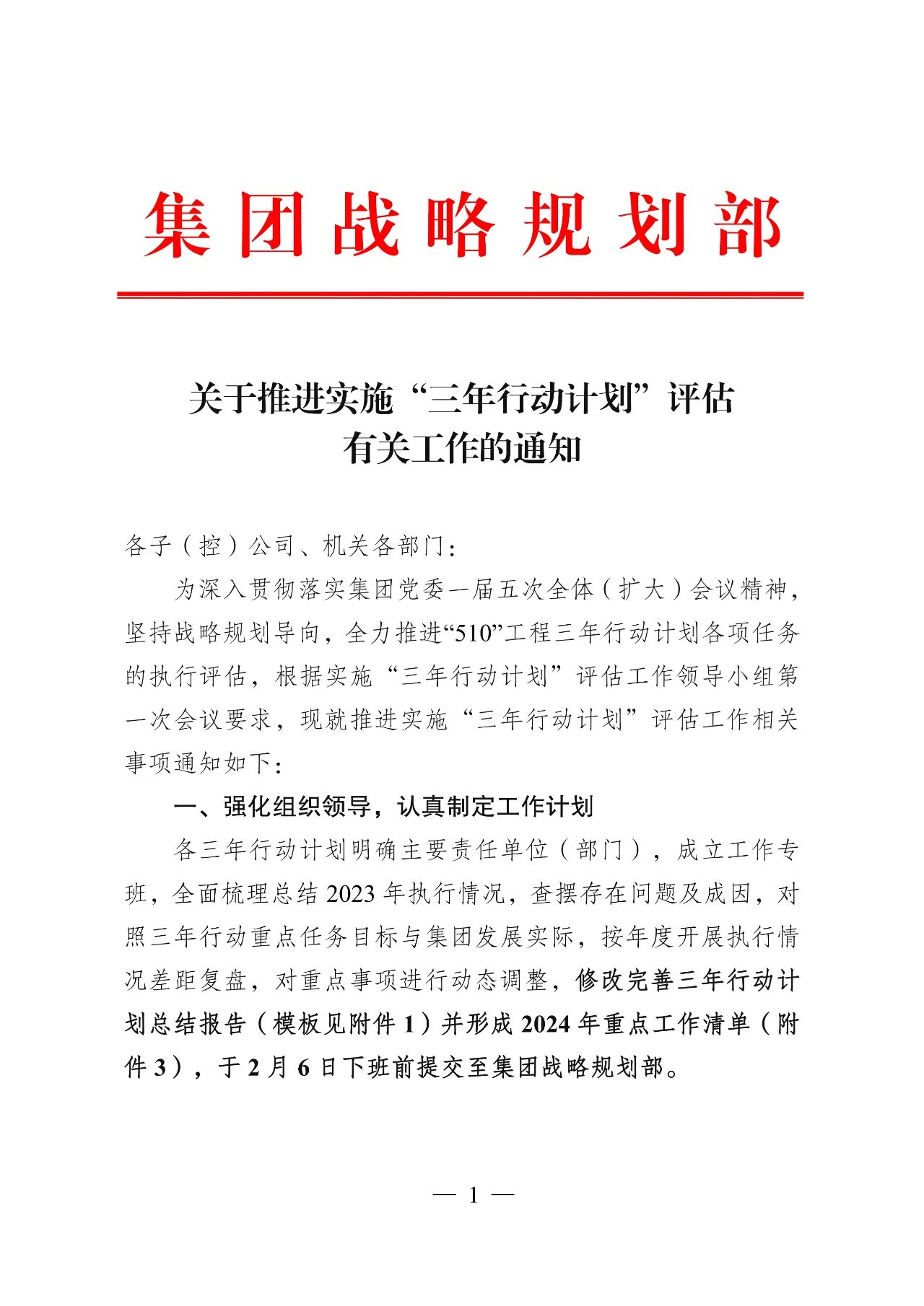 2024年是集團全面完成“十四五”規劃目標任務的關鍵之年,為深入貫徹集團黨委一屆五次全體(擴大)會議精神,在三年行動計劃上突出落地見效,以三年計劃的完成保證“十四五”各項目標任務如期實現?!叭晷袆佑媱潯痹u估工作領導小組辦公室緊緊圍繞集團三步走戰略發展總體要求,完善“專班化推進+項目化實施”運作方式,做好階段性評估,常態化督查,扎實推進“510”工程等三年行動計劃各項工作走深走實。