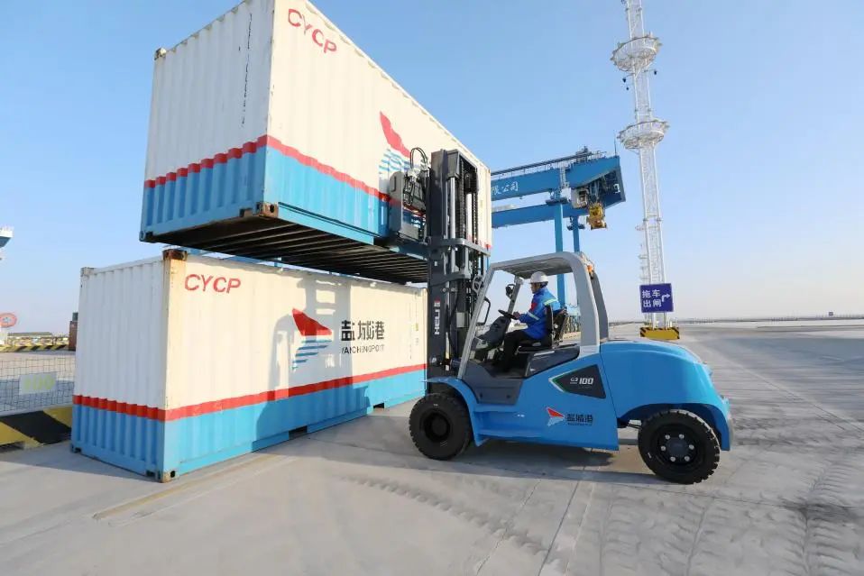 鹽城港自動化集裝箱堆場自運營以來,以提高效率和減少碳排放為目標,借助數字化、智能化等技術優勢,堆場作業自動化率提升至95%,單箱作業效率提升至32箱/h,積極推廣清潔能源,如太陽能、風能等,建設充電樁、光伏發電、風能發電項目,打造微電網示范堆場,顯著減少能源消耗和碳排放,計劃使用288.75萬kWh綠色電力,減排二氧化碳1677.64噸,以實現堆場的“零碳運行”。2023年,“零碳堆場”得到國際論證,為零碳港口的創建打下堅實基礎,也標志著我市港口行業在綠色發展道路上取得了里程碑式的突破。