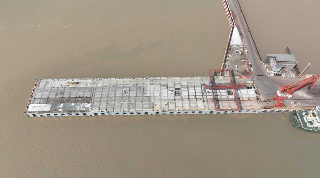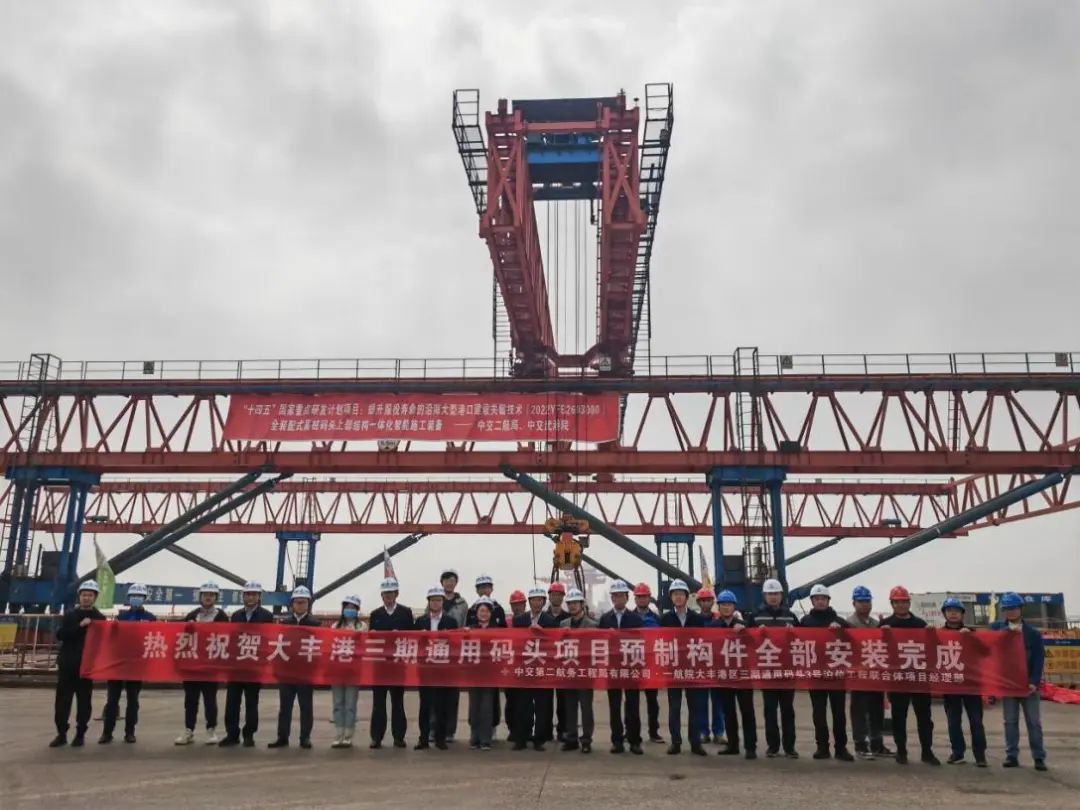 隨著最后一榀預(yù)制面板在智能筑港機(jī)的精準(zhǔn)操控下平穩(wěn)就位,鹽城港大豐港區(qū)三期通用碼頭3號(hào)泊位項(xiàng)目圓滿完成全部預(yù)制構(gòu)件安裝任務(wù)。這一重要節(jié)點(diǎn)不僅標(biāo)志著碼頭主體工程建設(shè)進(jìn)入最后沖刺階段,更意味著由項(xiàng)目建設(shè)、設(shè)計(jì)、施工等參建各方聯(lián)合中國海洋大學(xué),依托國家重點(diǎn)研發(fā)計(jì)劃開展的核心技術(shù)攻關(guān),為該項(xiàng)目量身打造的“智能積木拼裝師”——全球首創(chuàng)裝配式碼頭一體化綠色智能筑港機(jī)成功完成示范應(yīng)用。