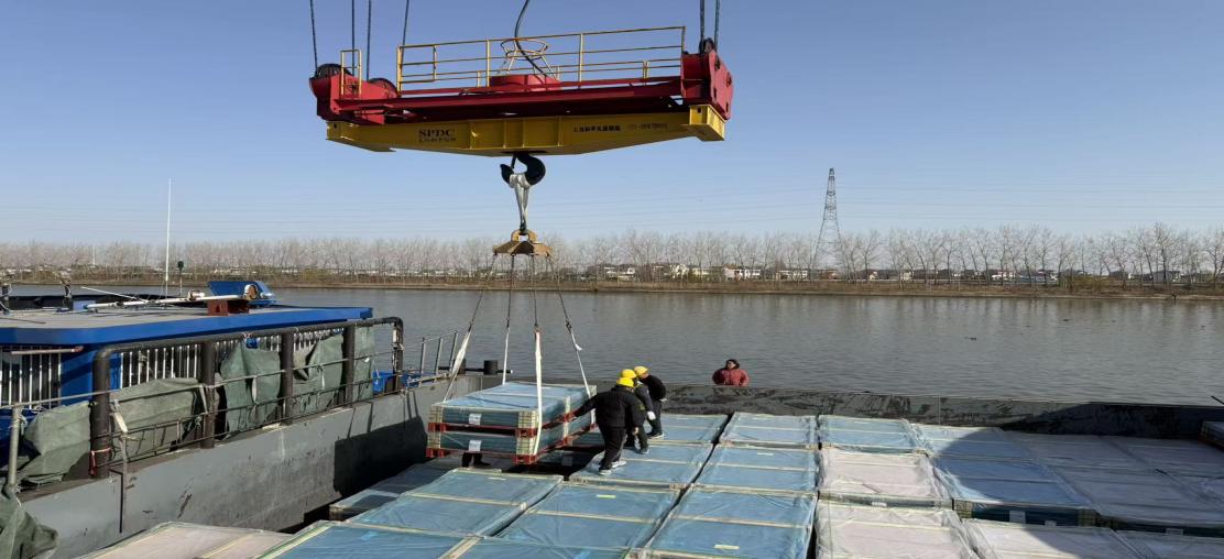 光伏組件因其單板尺寸超規、重量集中且表面玻璃極易受損的特點,對裝卸精度和防護措施提出了“毫米級”要求,這也是行業內大型光伏設備運輸的共性難題。為應對這一挑戰,亭湖港提前部署專項攻堅方案,組織骨干開展吊鉤專項操控培訓,重點強化重心平衡控制與防損操作規范;創新優化裝卸流程設計,模擬船舶甲板至陸域轉運全場景,通過反復推演打磨吊裝軌跡,徹底消除作業盲區,成功實現組件“零損傷”裝卸。