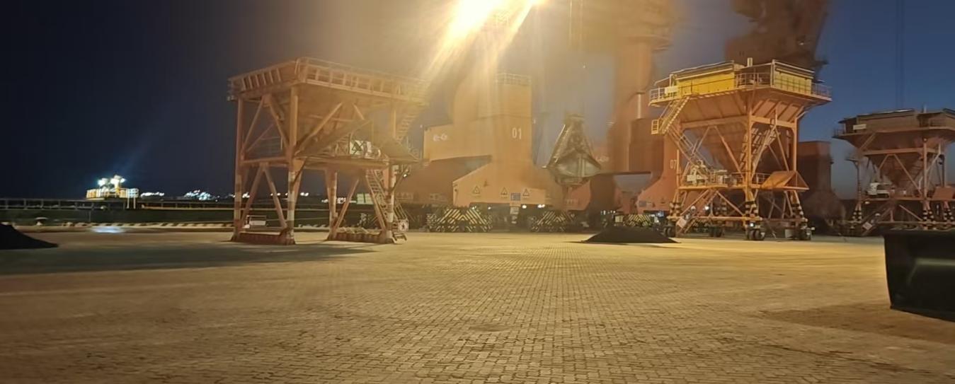 船舶抵港前,現場調度人員根據實地實情統籌協調,對泊位前沿、堆存場地等做到全流程銜接;生產運營負責人積極聯系海關、海事等口岸單位優化通關流程,為貨物快速通關開辟綠色通道;卸貨前,門機司機及時查驗抓斗作業精準度和作業穩定性;針對石油焦易揚塵等特點,設置專用隔離區域,同步啟用噴淋降塵系統,在卸船、轉運、堆存各環節實施全程濕法作業,全過程實現“零污染、零損耗、零事故”。