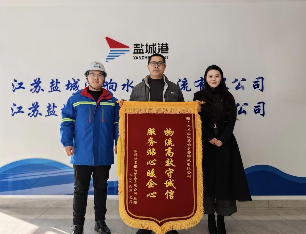 近日,響水港區收到一面來自蘇州旭友糧食貿易有限公司,印有“物流高效守誠信,服務貼心暖企心”的錦旗,不僅見證了兩家企業攜手共贏的深厚情誼,更是對港區優質、高效、貼心服務的充分肯定。
