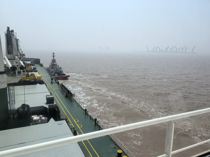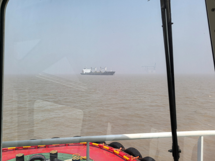 登輪后,引航員迅速通報能見度態勢,立即啟動應急處置流程。指令船舶開啟自動霧號、強化雷達值守精度、增派專職瞭望人員、播發航行警報,全程嚴密監測周邊通航環境。依托豐富的大型船舶引航經驗,引航員精準捕捉短暫的能見度“窗口期”,沉著應對西南風5級、湍急水流及船舶大吃水等多重考驗,精準操控船舶轉向、調速,確保航行軌跡始終可控。