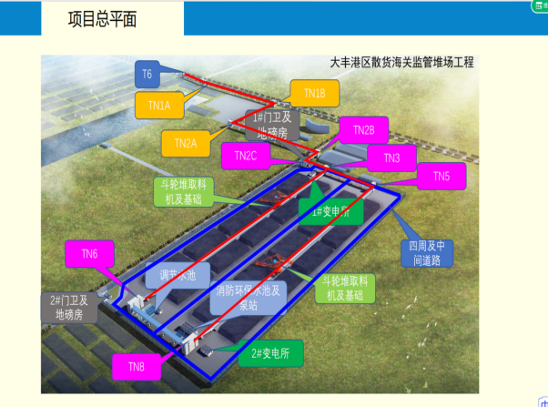 該項目陸域用地面積25.03萬㎡,其南北向縱深約736.83米,東西向寬度則約為318.97米。作為大豐港區重點工程的一部分,該項目從二期散貨堆場已建的T6轉運站預留的2路皮帶機接口延伸而來,旨在通過T6轉運站皮帶機的延伸及大豐港現有臨時堆場用地范圍內相應配套設施的建設,進一步提升港口的功能性和效率。