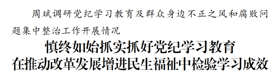 周斌在調(diào)研中指出,黨紀學習教育要強化原文研學,深學細悟習近平總書記關(guān)于全面加強黨的紀律建設(shè)的重要論述,堅持融入日常、抓在經(jīng)常,持續(xù)在深化內(nèi)化轉(zhuǎn)化上下功夫,引導黨員干部更好把遵規(guī)守紀刻印在心。要強化警示教育,用好紅色資源、鮮活案例和生動現(xiàn)場,加強正面引導和反面警示,讓黨員干部受警醒、明底線、知敬畏,真正做到知行知止。要強化學用結(jié)合,堅持兩手抓、兩促進,將黨紀學習教育與整治形式主義為基層減負、整治群眾身邊不正之風和腐敗問題、推進經(jīng)濟社會高質(zhì)量發(fā)展相結(jié)合,在嚴格約束下積極擔當作為,切實把學習成效轉(zhuǎn)化為推動改革發(fā)展、增進民生福祉的實際舉措,真正讓黨員受教育、發(fā)展見成效、群眾得實惠。