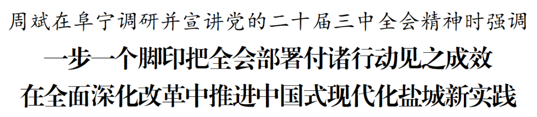 8月2日,市委書記周斌在阜寧縣調(diào)研并宣講黨的二十屆三中全會(huì)精神。他強(qiáng)調(diào),要把學(xué)習(xí)貫徹黨的二十屆三中全會(huì)精神作為當(dāng)前和今后一個(gè)時(shí)期的重大政治任務(wù),用心學(xué)習(xí)領(lǐng)會(huì),全面深化理解,廣泛宣傳宣講,一步一個(gè)腳印把全會(huì)改革部署付諸行動(dòng)、見(jiàn)之成效,在全面深化改革中推進(jìn)中國(guó)式現(xiàn)代化鹽城新實(shí)踐。