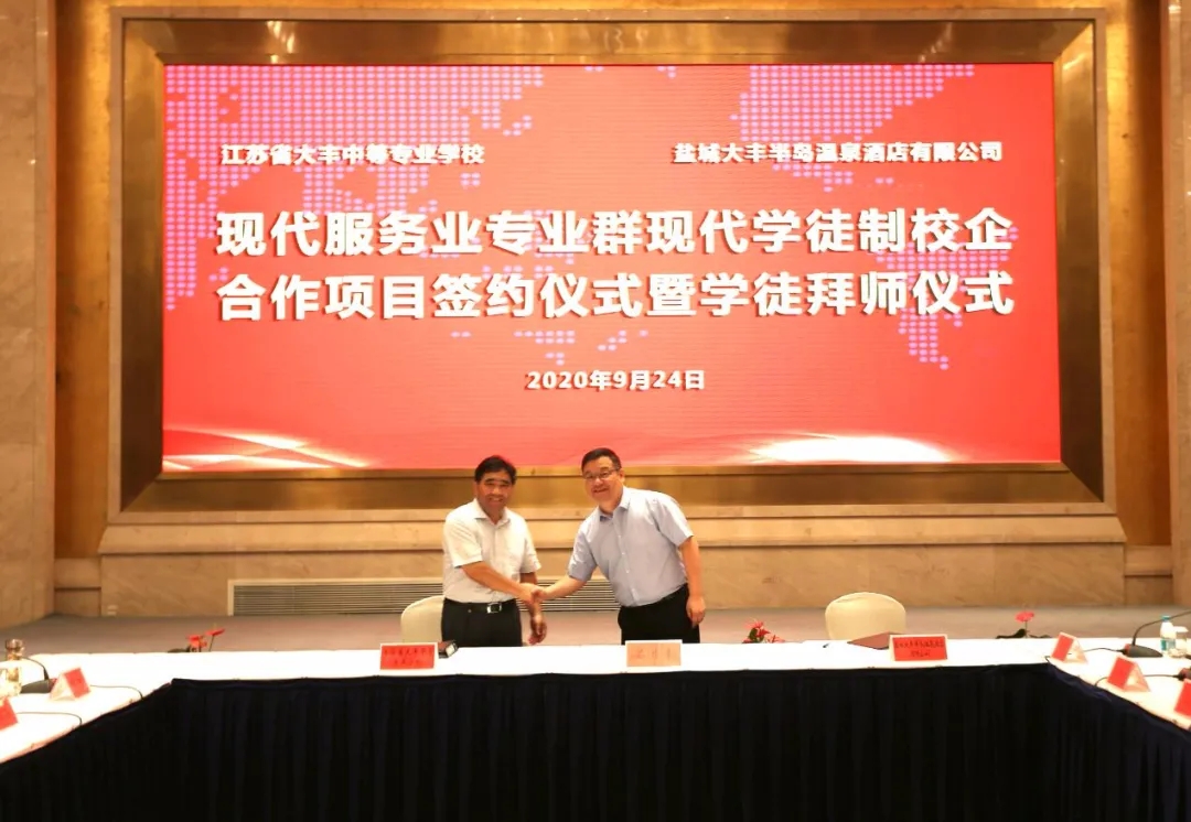 據悉,大豐中等專業學校和大豐港集團旗下半島溫泉酒店簽訂協議,雙方將共同探索建立校企“聯合招生、聯合培養、定向就業”的人才培養長效機制,為創新人才培養方式提供了一個嶄新平臺。通過合作,學校和企業進行優勢互補,實現資源共享?;顒又?,學校、酒店、家長、學生四方代表簽訂了現代學徒制工學交替跟崗實習協議,并舉行首批學徒制拜師儀式,23名學生順利拜師跟崗。