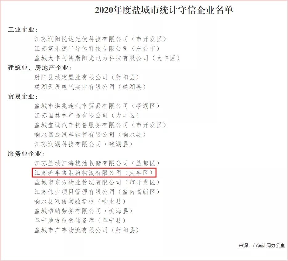 近日,通過嚴(yán)格審核,鹽城港滬豐集裝箱公司被鹽城市統(tǒng)計(jì)局評為“2020年度統(tǒng)計(jì)守信企業(yè)”,充分體現(xiàn)了滬豐公司重視和加強(qiáng)誠信管理體系建設(shè)所作出的努力,對塑造公司誠信經(jīng)營形象、提升物流市場競爭力具有重要意義。