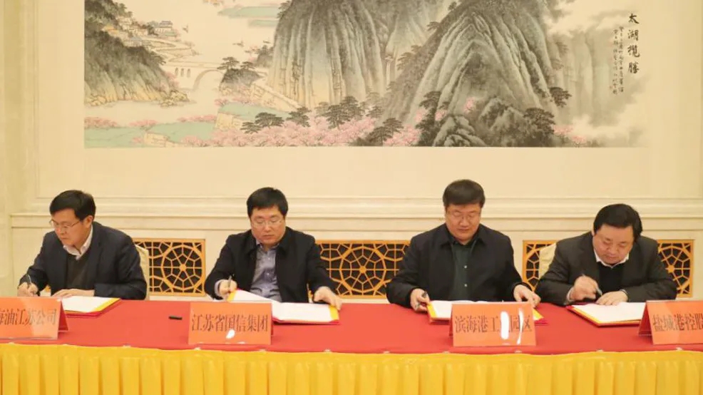 3月2日,濱海港工業園區、省國信集團、中海油江蘇天然氣公司、鹽城港集團在南京簽訂四方合作協議。市委常委、濱海縣委書記、濱海港工業園區黨委書記孫軼出席簽約儀式。集團黨委書記、董事長、總經理周正雄與三家合作單位相關負責同志共同簽訂《合作協議》。