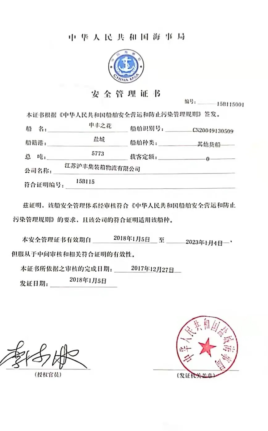 近日,鹽城海事局派出4人審核組對(duì)鹽城港集團(tuán)集裝箱板塊下屬江蘇滬豐集裝箱物流有限公司進(jìn)行DOC年度簽注及船舶安全管理證書中間審核。滬豐公司高度重視,體系內(nèi)成員精心準(zhǔn)備,順利通過了此次審核工作。