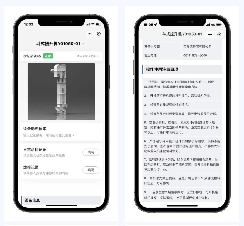 巡檢及維保人員只需通過微信掃描設備上的二維碼,即可對照小程序檢查條目逐條確認并記錄工作內容,快速記錄設備狀態、檢修設備,也可以根據小程序中顯示的設備常見故障以及排除方法,第一時間判斷設備問題并及時通知機務進行修復,及時消除存在隱患。