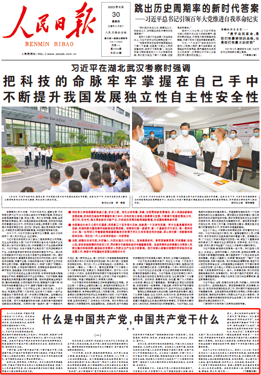 6月30日,人民日?qǐng)?bào)頭版刊發(fā)“宣言”署名文章《什么是中國共產(chǎn)黨,中國共產(chǎn)黨干什么》。文章指出,了解中國,必須了解中國共產(chǎn)黨;了解中國共產(chǎn)黨,才能讀懂中國。歷史已經(jīng)證明并將繼續(xù)證明,中國共產(chǎn)黨是用馬克思主義武裝起來的覺悟者,是最廣大人民利益的守護(hù)者,是人類社會(huì)發(fā)展方向的引領(lǐng)者,是最光明最正義最壯麗事業(yè)的奮斗者。
