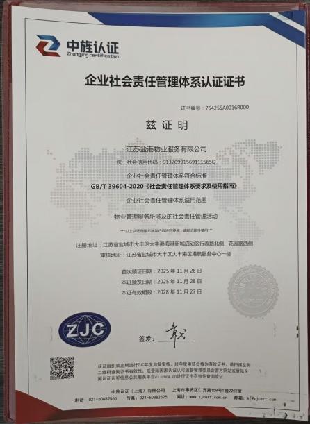 此次獲得的五項 ISO 管理體系認證,是對鹽港物業綜合實力的全面肯定,更構建起公司高質量發展的“五大基石”:在誠信管理方面,公司將進一步規范經營行為,強化契約精神,以誠信贏取客戶與市場的信賴;在環境管理方面,將持續踐行綠色發展理念,優化能源資源利用,減少環境影響,打造生態友好型物業服務場景;在職業健康與安全管理方面,將不斷完善安全防控體系,保障員工與服務對象的生命財產安全,營造安全穩定的工作與生活環境;在質量管理方面,將以ISO標準為標桿,細化服務流程,提升服務精準度與滿意度,為客戶提供更專業、更優質的服務體驗;在企業社會責任管理方面,將主動融入社會發展大局,在公益事業、社區共建等方面積極作為,彰顯企業擔當。