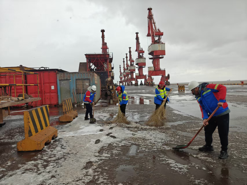智慧港口公司迅速成立專項清雪除冰突擊隊,備足融雪劑、防滑墊等應急物資,采取“人工輔助、循環作業”模式,干部職工頂風冒雪清掃碼頭棧橋主干道,對邊角縫隙、臺階坡道等機械作業盲區逐一清除積冰。黨員干部扎根一線,加大巡查頻次,在關鍵路段鋪設防滑設施、噴灑融雪劑,實時排查安全隱患,操作人員嚴格遵守作業規范,穿戴防滑鞋、反光背心等防護用品,嚴守降速穩行要求,切實將“冬季五防”要求落到實處。