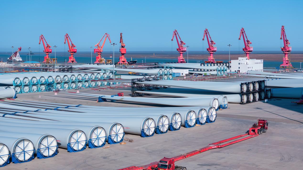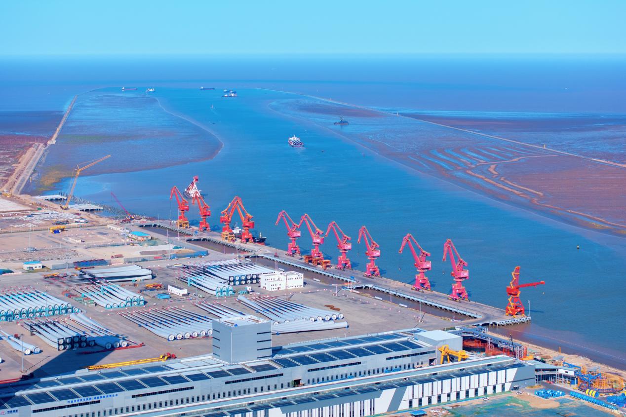 助力風電產業“乘風”出海。 面對風電葉片日益大型化的挑戰,集團各港區前瞻布局,系統提升作業能力。大豐港成功完成國內最長147米風電葉片裝卸作業;濱海港實現首單風電葉片的模具出運;響水港創新推出光伏支架“場地租賃+現場組裝+碼頭裝卸”一站式服務;射陽港圓滿完成金風科技“江蘇區域海上項目”、遠景能源“印度項目”等重點風電設備出運任務。依托運維基地建設,積極探索全鏈條服務能力,提供“從出廠到出港”全過程物流、“從部件到整機”全環節裝配、“從基地到風場”全周期運維服務,構建集專業吊裝碼頭、裝配場地與運維基地于一體的全鏈條產業生態?!笆奈濉逼陂g,風電設備吞吐量累計近1.3億噸,位列全國風電裝備“三大基本港”。