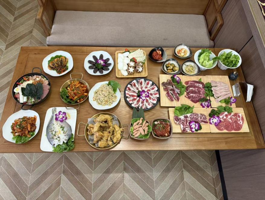 598元套餐(多人):牛五花、雪花牛板腱、LA 牛排、部隊(duì)火鍋、整只炸雞等韓式經(jīng)典,搭配南瓜湯、水果茶、生菜無限續(xù),聚餐氛圍熱烈。