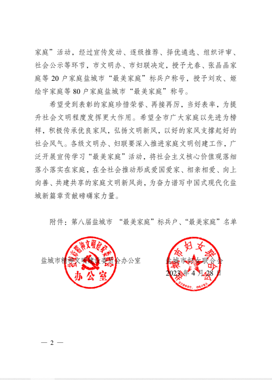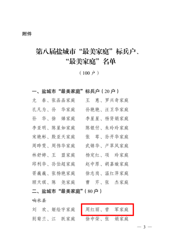 近日,從鹽城市婦女聯(lián)合會(huì)傳來(lái)好消息,在市第八屆鹽城市“最美家庭”評(píng)選活動(dòng)中,鹽城港響水港區(qū)曾軍家庭榮獲鹽城市“最美家庭”稱號(hào)。